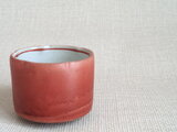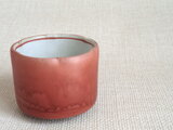 この作品は、細かい信楽の土を使いろくろで丁寧に作ったぐい呑みに、赤絵付をして焼成を重ねています。赤絵付はあえて均一にせず手仕事の温かさが感じられるように仕上げています。内側は白い釉薬をかけ、赤い線を入れています。中に入れたものが映える色味です。口縁は花形で滑らかな口当たりです。
