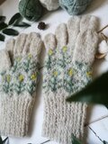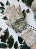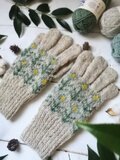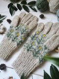 やわらかに積もった雪のような白に水色の花模様を編み込んだ、手編みの5本指手袋です。