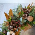花材:クジャクヒバ、ブルーアイス、ヒムロスギ、松ぼっくり、野ばらの実、メタセコイア、綿花