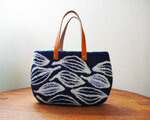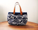 色は落ち着いた濃い色合いの紺をベースに葉脈をイメージした柄を施しました。総柄ですが落ち着いていて上品な仕上がりになりました。どんな装いにも合わせやすいバッグです。