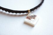 透明のレジンにホワイトシェルとガーネットのさざれを沈め、光沢のあるホワイトで囲ったレジンを、ベルベットリボンにタティングレースで装飾を施したチョーカーに仕上げました。