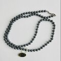 こちらは貝素材の原玉に、オリジナルパール塗料にて何層にも渡り重ね塗りを施した日本製貝パールネックレスになります。パールの間1つづつ丁寧に結び目を加えたオールノット加工にて仕上げました。パールカラーは、きめ細やかな質感と優しい艶感が特徴のブラックパール。やや薄めの色合いでオーソドックスなカラーです。パールサイズは直径約5mm、長さは服の上からでも気軽にお使い頂ける全長約63cmに。男女問わずちょっとしたお出かけに、普段使いにと気軽に着けられるサイズです。留め具部分には小振りですっきりとしたカラビナタイプを使用。