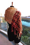 手織で作りましたマフラーです。縫うことなく輪に作りました。分け織りをしました縦糸と横糸を組ませています。色合いはベージュをメインに朱色やブラウンを織り入れています。材質はウールです。輪になっていますのでぐるっとどの向きに書けてもオーケーです。分け織り部分をおシャレに肩や背に出していただくと嬉しいです。