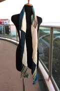 手織の布を用いてパッチワーク風に縫い合わせマフラーを作りました。布は斜めどり(バイヤース)なので柔らかく伸びちじみします。首周りソフトです。色合いは白、ブルー、いろいろな色の縞と言った布を使っています。材質はウールです。幅は8センチ長さは180センチ。布はダブルの筒状です。