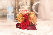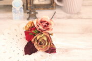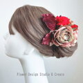 ピンクゴールドの薔薇と赤とモーブの薔薇の髪飾 フラメンコ ゴールド ボルドー フローレス バラ 赤いバラ アジサイ バラ 髪飾り
