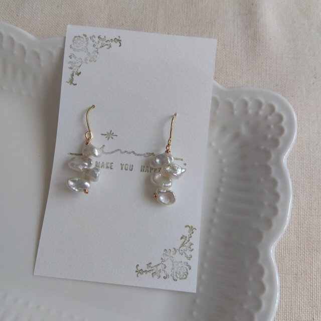 14kgf つやつや淡水ケシパールの華やかピアス