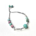 コロンとした可愛らしいインドで制作された手作りの古布ビーズと、程よい透明感の天然石マザーオブパールの優しい輝きを組み合わせた1点もののマクラメブレスレットです。
