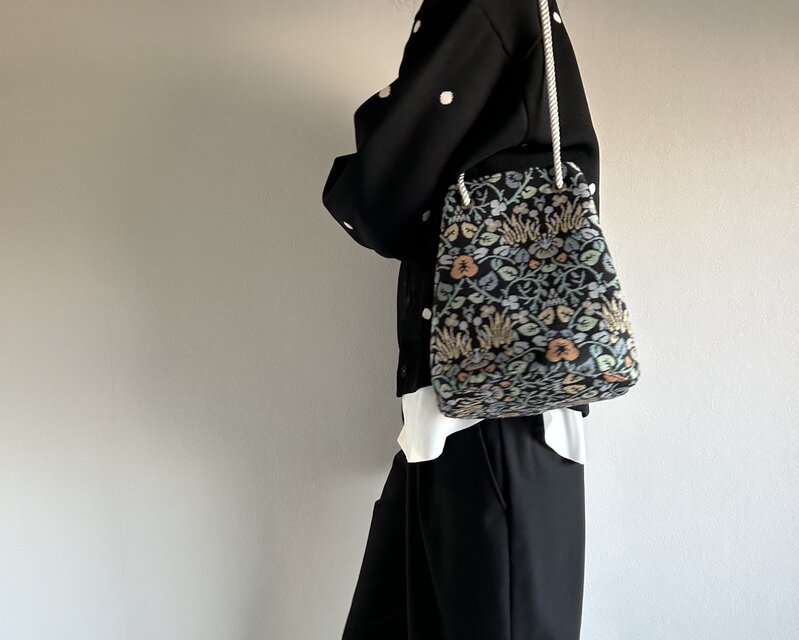 タペストリー調の織り模様と柔らかい生地感なので持っていて一目置かれそうな生地のショルダー型のバッグ。