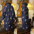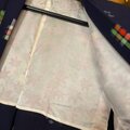 このアンサンブルは、深く落ち着いた濃紺の着物地に、赤、黄、緑など多色で描かれた四角い格子(チェック)や点描が特徴の、極めてユニークでモダンな逸品です。絣が、まるでドット絵やピクセルアートのような視覚的な遊び心を生み出し、知性と躍動感に満ちた和洋折衷スタイルを提案します。
