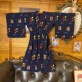 【 和洋折衷ミニミディワンピース 着物アンサンブル 名古屋帯サッシュベルト付き ハンドメイド レトロ 古着 濃紺・カラフル絣 aKW-111 】