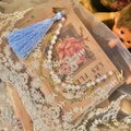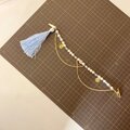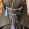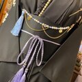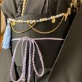 この帯飾りは、光を浴びることで乳白色の神秘的な輝きを放つロシアオパールと、気品あふれるパールビーズに、極めて幻想的でロマンティックな逸品です。金色のチェーンやチャームが、装いに特別な格調と奥行きを添えます。