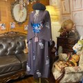 このワンピースは、深く穏やかなくすみパープル(グレージュ系の藤色)に、薄いベージュや白で古典的な花や葉が描かれています。その柄行きと色彩は、まるで古都の薄曇りの空のような静謐な美しさを放ち、身に纏う人に深い物語性を与えます。