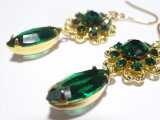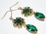 エメラルドカラーのグラスストーンをお花の形のフィリグリーにセットしたパーツと、ナベット(マーキス)型の、やはりエメラルドカラーのグラスストーンとを組み合わせたフックタイプのピアス。