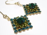 まるで孔雀の羽根のカラーリングを思わせる色合いのグラスストーンを組み合わせたダイヤ型のピアス。