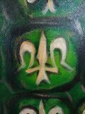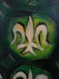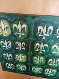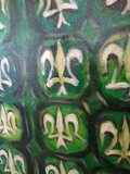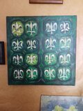 ここでは、ステンドグラスのような格子模様の中に16本の花を描きました。様々な色合いの緑を用いることで、瞑想的で癒しの色彩のフィールドを作り出しています。