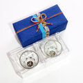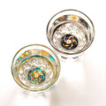 金粉を散りばめた澄んだ水色、もう一つには夜空の黒のバックに、中心部分に睡蓮の花、その周りに5匹の鯉を泳がし、全面に金箔を散らして、泳ぐ鯉をより象徴的に表現した、ガラスの盃二つセットです。