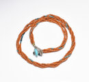 アンティークオレンジ色&水浅葱色&インディゴブルーシードビーズの4連ネックレス(ターコイズ留め金)