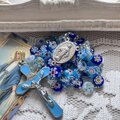 なるべくきれいなビーズを選んでつなげていますが多少の歪さ、花もきれいな形ばかりではありません。画像からもすべてが同じ形ではないことがおわかりいただけるかと思いますが完璧なビーズのロザリオをお求めの方には向いていないと思います。