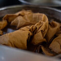カテキューで染めた、レジ袋タイプのミニバックです。レジ袋の使い勝手の良さはそのまま残し、ながくお使いいただけるように作りました。ロウを引くことで、撥水性と耐久性も加わり、初めは紙のような硬さのある手触りですが、使い込むほどに柔らかく馴染み、風合いが増していきます。