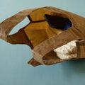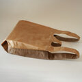 カテキューで染めた、レジ袋タイプのミニバックです。アルミ媒染による黄土色と、鉄媒染による茶色を組み合わせて仕立てました。レジ袋の使い勝手の良さはそのまま残し、ながくお使いいただけるように作りました。ロウを引くことで、撥水性と耐久性も加わり、初めは紙のような硬さのある手触りですが、使い込むほどに柔らかく馴染み、風合いが増していきます。