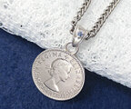 このコインはイギリスでは「富と繫栄のシンボル」として信じられていて、結婚式の際には花嫁の靴の左かかとにしのばせておけば、一族に繫栄がもたらられるとされています。エリザベス女王2世の即位の際に誕生し、400年にわたり使われてきた本物の6ペンスコイン、表面にはエリザベス女王の横顔。裏面にはアザミ、クローバ、バラ、ポロネギの紋章がデザインされています。さらに、バチカン部分には天然タンザナイトが1石セットされています。