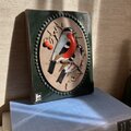 ドットで囲まれた深緑のフレームの中に、枝の上で寄り添うように小鳥が描かれた可愛らしく美しいデザインです。