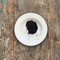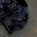古い洋書の間に眠っていたような、黒い平咲きの薔薇コサージュです。