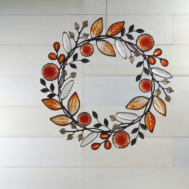 パート ド ヴェール という技法で作った ガラスのパーツを、ステンドグラスの技法でつないだリースです。