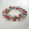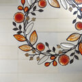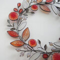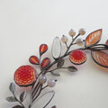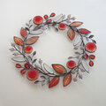 茜色の葉っぱとダリアに洋菊、白くなったエノコログサなどをモチーフに、草花の茎が絡まり合うように ゆるやかなラインでパーツをつないだ 花かんむりのような形の冬色のリースです。