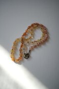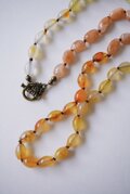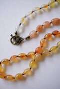 大粒のカーネリアンに同系色のサンストーンタンプルを組み合わせ、太めのドイツ製絹糸で一粒ずつ結んだオールノットネックレスです。ブレスレットとしても使用できるよう長さを調整しております。全体的にしなやかでエレガントな大人のアクセサリーです。