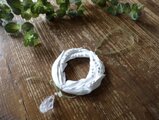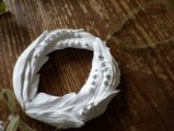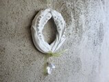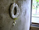大き目のリースのオーナメント。よく見ると珍しい鈴蘭のデザインです。朝露の結晶のように清らかなシンボルとして、天然石である水晶の大きなドロップをぶら下げています。ワイヤーとオーガンジーリボンでさわやかで軽やかに仕上げました。