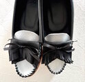 つま先には光沢感のあるアクセント素材、甲部分にはフリンジとリボンを重ねた大人かわいいデザイン。