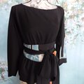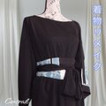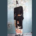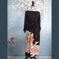 幅広のサッシュベルトでウエストをしっかりマークし、留袖の帯地を再利用した贅沢仕様。高級感とメリハリを演出