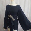 ボートネックでデコルテを美しく見せ、ゆったりとしたワイドスリーブが優雅な動きを添えるデザイン。