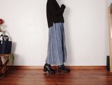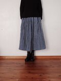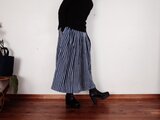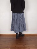 スカートのデザインは、前後に6つずつタックが入ったボリューム感のあるスカートです。長さと生地の厚みがあるので拡がりすぎず落ち着いた印象です。ウエストはゴムですのでとても着心地が良く脱ぎ着も楽です。ゴムサイズは緩めにしていますので必要であれば調整ください。ポケットの内布は手触りの良い兵庫県西脇市の伝統先染め織布播州織を使用しています。