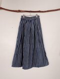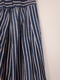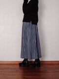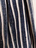 ブルキナファソのダフィン族の伝統藍染生地のスカートです。藍染した糸を縞模様に手織りした帯状の生地を繋ぎ合わせて1枚の大きな生地にしています。ずっしりと厚みのある貴重な生地を余すことなく1枚すべて使いました。こちらは、縞模様の幅をランダムに変化をつけていて、アフリカンデザインのセンスが光ります。1枚1枚手織りですので、全く同じデザインの生地はほとんど見つけることができません。