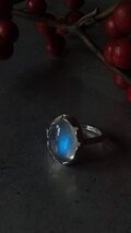 青紫色のシラーがとても美しい涼しげなホワイトラブラドライトを-咲き始める花-シルバーリングに仕立てました。