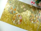 金糸に鳳凰や御所車、蝶などの吉祥文様です。裏側も綺麗な金糸に花文様ですので両面使用できます。