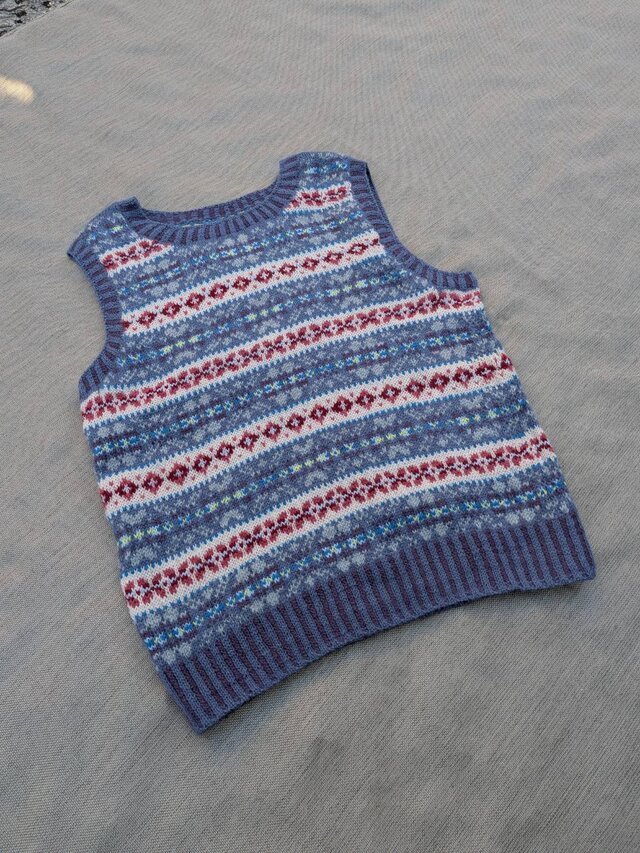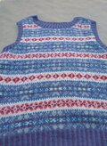 青色の中に花をちりばめて華やかに編んでみました。フェアアイルなのでベストでもとてもあたたかいです。