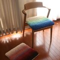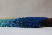 十数色の色に原毛を染め分け、色を混ぜて糸に紡ぎ、その糸をまた混ぜて十数本引き揃えてノッティングしました。他に同じものは作ることができない一点ものです。