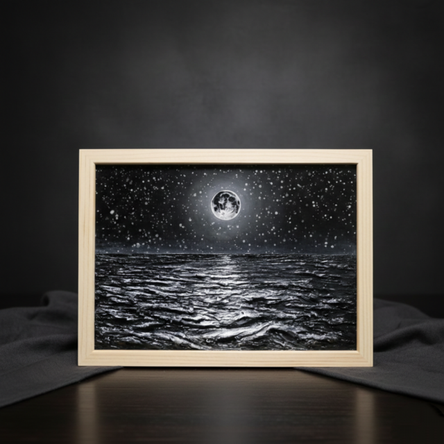 「白黒の満月と星空の海」は、「画面いっぱいに広がるモノクロームの世界が、かえって満月の神秘的な輝きを強調しています。油絵具のマチエール(絵肌)によって表現された波の力強い動きと、空に瞬く無数の星々との対比が印象的です。月の光が海面に描き出す「月の道」は、鑑賞者を幻想的な風景へと深く引き込み、深い安らぎと内省の時間をもたらしてくれます。色彩を抑えた表現だからこそ、光と影、そして自然の雄大さがダイレクトに心に響く、力強い作品です。」