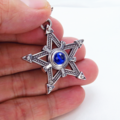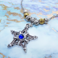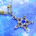 中心に蒼い輝きをもつシルバーカラーのペンタグラム(五芒星)をモチーフとしたペンダント・ネックレスです