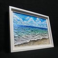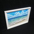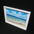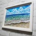 この油絵は、やや大きめのサイズで、横420mm・縦297mmの厚紙に描かれており、白色の額縁(横47.5cm・縦35.5cm・厚さ2.5cm)に収められています。シンプルながらもインパクトのあるデザインは、どんなインテリアとも調和し、特別な空間を演出します。壁掛け用の金具も付属していますので、お好きな場所に簡単に飾ることができ、心地よい夏の雰囲気を楽しむことができます。「夏の砂浜の海」は、大切な方への贈り物や特別な瞬間を分かち合う際にも自信を持っておすすめいたします。
