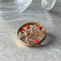赤い果実の成る木をイメージしたゴールドトーンサークルピンブローチ。