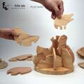 これは、特別に設計・加工されたヒノキ板を組み合わせて作られた、立体のアヒル作品です。12個のユニットがアヒルの体のさまざまな部位に配置され、それぞれ異なる大きさと形をしています。組み立ての過程では、ひとつひとつのユニットを手に取るたびに、その独特な形状が探索の時間を与えてくれます。それは、プレイヤーが頭の中でアヒル全体の形を思い描き、このパーツがどの位置に当てはまるのかを想像する手がかりとなります。立体形状が完成すると、異なる輪郭を持つユニット同士が視線の角度が合った瞬間にぴったりと組み合わさり、独特の彫刻的な鑑賞の面白さを生み出します。