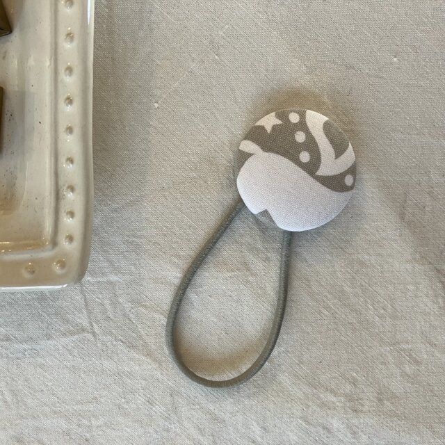 小さな北欧模様の布地にグレーのゴムで仕上げました。グレー好きにはたまらないかわいい色合いの髪留めに仕上がりました。