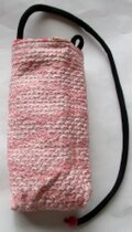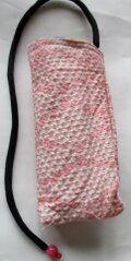 袋の口の片側に、ループの輪をつけ、中にループの端を通して結ぶようにしてバックや腰に下げるようにしています。