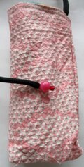 中綿を入れ、黒の着物で作ったループをつけ、ループの先に、ピンクの石の玉と山サンゴを付けています。