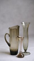 1930年代にドイツのWMF社で製造された、アール・デコ期の気品漂うヴィンテージ・ガラスのフラワーベース。シャープでありながら有機的な曲線美が目を引きます。スモーキーな色調のガラスは、光を吸い込むような独特の深みがあり、100年近い時を経た今なお、色褪せることのないモダンな存在感を放っています。当時のドイツの職人が一つひとつ丁寧に仕上げたこの花瓶は、薄く繊細な口縁から足元にかけての流麗なラインが美しく、ドライフラワーや枝物をシンプルに飾るだけでもまるで絵画のような佇まいになりそうです。