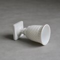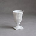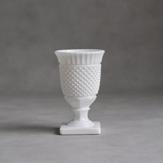アメリカを代表するミルクガラスメーカー、Westmoreland(ウエストモーランド)社製のフラワーベース。古き良きアメリカの「オールド・キルト」パターンが施されています。その名の通り、パッチワークキルトのような細かな格子模様が連なり、光を受けるとパイナップルのような愛らしい表情を見せてくれるのが特徴です。